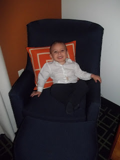 | Nathan at the start of our road trip. We borrowed a portable DVD player for the trip and brought like, oh, 15 movies so that we'd have plenty of variety. Oh don't worry-- he watched the same movie for the. whole. trip. Curious George is a favorite of his these days. |